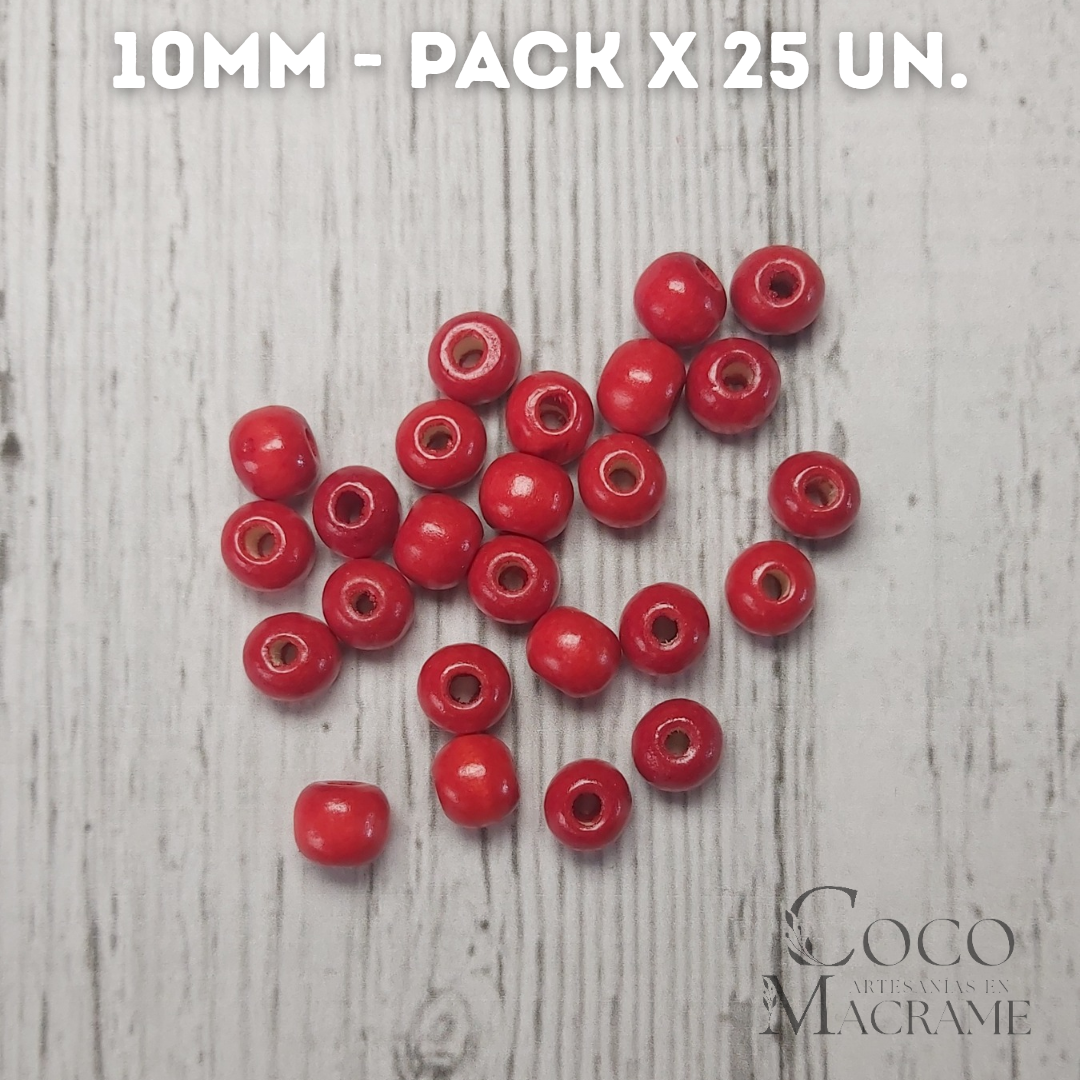 Cuentas de madera rojo 10mm x 25 un.